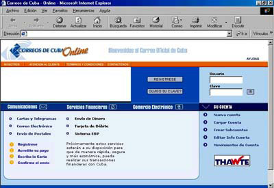 "Cartero" cubano en la red global Félix López Como parte de la transformación estructural y de imagen que se opera por estos días en el servicio postal del país, la empresa Correos de Cuba inauguró un nuevo portal internacional, extendiendo a la red servicios que se prestan desde tiempos remotos en los ventanillos de esa institución. Ahora, existe una unidad virtual a la que se accede a través de la dirección www.correodecuba.com. De esta forma, la carta que podía demorar 15 días entre La Habana y la más lejana ciudad del planeta llega en unos pocos minutos. Pero el portal de Correos no solo ofrece la posibilidad de enviar cartas, telegramas, e-mail y postales. En breve se incorporarán novedosos servicios financieros, con facilidades para el envío de dinero y para que los clientes puedan agilizar sus transacciones financieras con Cuba.