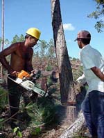 Un total de 100 hombres, reforzados por yuntas de bueyes propias y de los campesinos de cooperativas cercanas que diariamente apoyan la tarea, tienen la responsabilidad de enviar madera a las vegas sanjuaneras. Cabezas dice que está dando un buen aporte además una brigada de la Empresa de Desmonte y Construcción, empleada en el mejoramiento de los viales que estaban intransitables. Se han resuelto casi todos los recursos necesarios, aunque presentan dificultades con las limas para afilar las motosierras. Afirma que las 61 hectáreas a cortar serán repobladas en la próxima campaña y no comprometen la entrega de 5 000 metros de madera en bolo que la unidad debe suministrar anualmente a los aserríos. El viernes, día de nuestra visita, un grupo de campesinos de la Cooperativa de Crédito y Servicios (CCS) Abel Santamaría, con sus yuntas de bueyes, contribuía al acarreo de madera hasta uno de los acopiaderos. "Somos 50 socios, quienes nos hemos dividido en cinco brigadas; cada día viene una a apoyar esta tarea que en definitiva es también nuestra, pues de aquí salen los recursos para construir las casas de tabaco de los cooperativistas", expresa Luis Fidel Hernández, uno de los boyeros. UN PINO EN 20 SEGUNDOS El trabajo de los forestales es duro y engorroso; pudiera afirmarse que ninguna actividad en el monte resulta fácil. Pero el alma de una brigada de tala la constituye, sin duda, el "motoserrero", como llaman al que opera ese equipo capaz de echar abajo una pequeña plantación en cuestión de horas. Divaldo es el nombre del trabajador que tiene esa responsabilidad en el frente de San Simón de las Cuchillas. En 20 segundos le vi derribar un grueso pino, y sin tomar respiro acometió el siguiente. Cortar y enviar a las casas de tabaco que ya están en construcción en San Juan y Martínez toda la madera que los carpinteros demanden, es una alta meta para la unidad silvícola; cuando se suman todas las empresas forestales y tabacaleras como suministradoras y receptoras, es fácil comprender que se trata de una compleja operación. Ese es el reto que tienen quienes dirigen, apoyan y ejecutan un esfuerzo constructivo sin precedentes, para cuya materialización no puede fallar ningún eslabón de la cadena. |