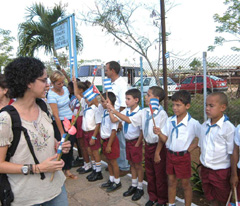 Yamaira, hija de Carlos Muñiz Varela, con los pioneros del centro