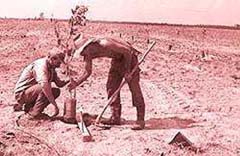 vivero en hoyos perfectamente alineados; previamente se han