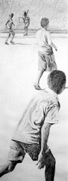 bolas", en una esquina cercana a un registro de agua; otro niño que