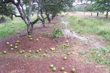 las vías, plantaciones citrícolas con frutas caídas en plena