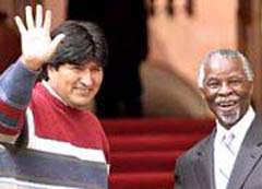 Evo Morales y el presidente sudafricano Thabo Mbeki. El Presidente electo boliviano concluyó este jueves su visita oficial a Sudáfrica tras mantener una entrevista con el Arzobispo retirado Desmond Tutu.