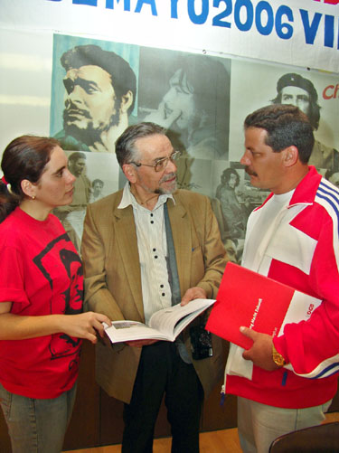 Liuben entregó un ejemplar de su libro a Irma González y Camilo Rojo, integrantes de la delegación cubana a la Cumbre Enlazando Alternativas.