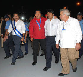 Los presidentes de Venezuela y Bolivia junto a Daniel Ortega.