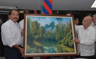 El Vicepresidente del Consejo de Estado de Cuba, José Ramón Machado Ventura le entregó a Daniel Ortega un cuadro del pintor cubano Jesús Lara.