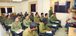 sesión de clases. Un grupo de soldados entra disciplinadamente al