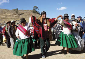 lleguen a la población boliviana de Tiahuanaco para participar en la