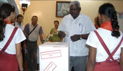 custodiada por pioneros de las escuelas primarias Gustavo y Joaquín Ferrer y Luis Arcos Bergnes, a los cuales felicitó por