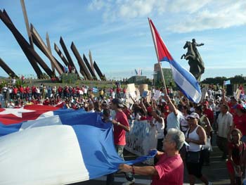 cientos de banderas cubanas, de consignas, globos, flores y carteles