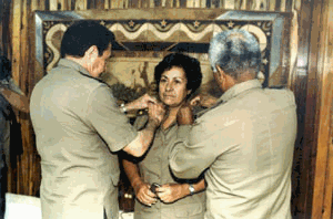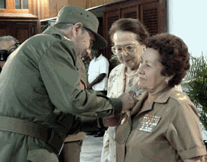 Momento en que el Comandante en Jefe le impone a la General Teté Puebla el título de Heroína de la República de Cuba. Le respondí que no, porque eso era un símbolo de nuestra lucha y le aclaré que los que íbamos a entregar eran soldados y no guerrilleros. También le precisé que el último de nosotros moriría combatiendo en la Sierra, antes de rendirse. Aceptaron la tregua. A las seis de la tarde ya Fidel y el Che tenían en sus manos la respuesta. A pocos metros de arribar al firme de la Maestra los compañeros me cargaron en hombros pues pensaban que me habían matado. Fidel les contestó la carta y volví al campamento enemigo. ¿Cuándo volvió? Ese mismo día. Ya era de noche. Me pusieron los reflectores. Me preguntaron qué quería y les dije nuevamente que ver a su jefe, para entregarle una carta de Fidel Castro. La posta me pidió que se la entregara y le dije que no. Mandaron a buscar a Durán. Esa noche dormí en el campamento de los soldados. Durán me dio su camita y puso al lado su hamaca para que no me pudiera mover. Esperé a que se durmiera y me fui para las trincheras a conversar con los guardias. Les revelé que los que se iban a entregar eran sus propios compañeros que estaban en nuestras manos y aproveché para conocer dónde tenían el mortero, postas, etc. ¿En qué momento fue la entrega de prisioneros? Al otro día, a la Cruz Roja Internacional, en la persona de René Jecquier Pierre Schoenholzer. Entregamos 257 prisioneros. Había 23 heridos. Era el 23 de julio de 1958. Después me enviaron a Santiago de Cuba. ¿A qué? Al terminarse la tregua estábamos sin alimentos, medicamentos ni vías de comunicación. Había que mandar una gente a Santiago de Cuba. Me brindé pues conocía la ciudad. Al principio Fidel no quería, debido a que muchos soldados me podían identificar por haber participado en la entrega de los prisioneros. Finalmente, accedió, ya que Celia lo convenció. Fui en tres oportunidades antes que se crearan Las Marianas. ¿Cuándo se creó el Pelotón de las Marianas? El cuatro de septiembre de 1958, por iniciativa de Fidel. El Comandante en Jefe escogió ese nombre como homenaje a Mariana Grajales, la madre de los Maceo, una mujer extraordinaria, heroína de nuestra Guerra de Independencia. Algunos compañeros se pusieron furiosos, pues no les gustaba la idea de un pelotón de mujeres. Entre los mayores opositores estaban Eddy Suñol y el médico Bernabé Ordaz. ¿Qué argumentos empleaban? "Cómo se le iba a dar un arma a una mujer, si había rebeldes desarmados". Desconfiaban de nuestra capacidad combativa. También decían que cuando viéramos una rana o una lagartija, botábamos el arma y nos rendíamos al enemigo. ¿Cómo se resolvió la situación? En una reunión que se celebró en el hospital de La Plata, Fidel les habló durante siete horas. Les dijo que éramos mejores soldados que ellos. Como prueba de su confianza, nos designó su guardia personal. Nos entrenó, enseñó a tirar. Llegamos a partir una peseta a 50 metros. Nos entregó fusiles M-1. Después, en la Sierra, cada vez que llegábamos a algún sitio, la gente decía: "Llegaron Las Marianas, ahí esta el Comandante". Inicialmente, ¿cuántas integraron el Pelotón? Ocho compañeras. Después se extendió a quince y terminamos la guerra trece, pues dos se enfermaron. Como Jefa fue designada Isabel Rielo. ¿Por qué escogieron a Isabel? Fidel planteó que quien tuviera mejor puntería sería nombrada jefa del pelotón. Una moneda sirvió de blanco. El primer disparo lo hizo Fidel. Isabel me ganó por una pequeña diferencia. Fui designada como segunda. A ambas nos hizo teniente. Celia desempeñó un papel muy importante en la creación de Las Marianas. Celia, ¿estaba atenta a los más pequeños detalles? Sí. Cuando hablamos de Celia hay que hablar de Fidel y viceversa. No hay nada en la Sierra que no tuviera la mano de Celia. Estaba atenta a los más mínimos detalles: si una campesina iba a parir, de los medicamentos, dónde había que hacer los hospitales, las escuelas. En medio de la ofensiva, cuando estábamos cercados por 10 000 guardias, no dejó de preocuparse por los campesinos. Si un combatiente tenía un familiar enfermo en el llano, se ocupaba de que fuera atendido. Después del triunfo revolucionario mantuvo esa dedicación, preocupación. Celia fue el alma de la Sierra Maestra. ¿Cómo era el desenvolvimiento de una mujer entre tantos hombres? Un gran respeto, compañerismo y solidaridad humana. Tuvimos etapas muy difíciles en que no había comida, medicamentos, ropas, zapatos, tomábamos agua de bejuco. Éramos una tropa nómada. Cuando parábamos cerca de un arroyo, al no tener jabón, les lavábamos la ropa con una piedra a los compañeros. La única ropa que tenían era la que llevaban puesta. Los zapatos de Fidel y Raúl estaban amarrados con alambre. En una época, a Raúl le decíamos "el capitán trapito", por la cantidad de remiendos que tenía su ropa. El ser jefe no les daba ningún tipo de privilegio. Todos éramos iguales. Jamás Fidel, Raúl, Che, Camilo, Almeida se sintieron superiores. Además, con una profunda calidad humana. Fidel siempre tuvo fe en la victoria. En los momentos más delicados nos hablaba de los planes de la Revolución cuando llegara al poder, pero siempre insistía en que cuando se terminara la guerra íbamos a comenzar una lucha más difícil. En ningún momento lo vi desalentarse. Estuve muy unida a él hasta que bajé al llano. ¿En qué momento? El 9 de octubre de 1958. Éramos las primeras cuatro mujeres que íbamos a combatir en el llano. Al frente de la tropa iba el capitán Eddy Suñol. Cuando Suñol supo de nuestra presencia no nos quiso aceptar. Fidel le planteó que si no se llevaba a las muchachitas no se iba para el llano. Antes de terminar la guerra, Suñol le escribió una carta al Comandante en Jefe, en que reconocía nuestra valentía en el combate y que él había estado equivocado. ¿Para qué zona
