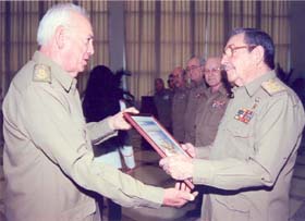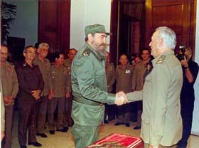En Girón se demostró una vez más la visión de Fidel. Le cayó encima al enemigo en todas las direcciones, con todos los hierros, no los dejó tranquilos ni un minuto para impedir que lograran una cabeza de playa. He tenido la suerte de vivir momentos trascendentales de nuestra Revolución: Clandestinidad, Guerra de Liberación, Lucha Contra Bandidos, Girón, Crisis de Octubre y Angola. —Angola, ¿qué significó para usted? —Una experiencia inolvidable. Estuve en tres ocasiones. La primera en 1977 en el Sur. Me impresioné tremendamente cuando me encontré con una tribu nómada. Estaban cocinando hierbas y raíces. Vi mujeres que no tenían más de treinta años y parecían viejas de sesenta. Estaban desnudas. Apenas con una mínima prenda. Eran madres con varios niños. Me golpeó el hambre. Una miseria increíble. Mediante un angolano que nos sirvió de intérprete, hablé con ellas. Esto ocurría no solo en el Sur sino en muchas partes de Angola. Empezamos a trabajar con nuestras tropas. Los combatientes crearon la base material de estudio para dar preparación combativa con escasos recursos. Logramos llevar adelante la instrucción en unas condiciones muy pobres. La zona era desértica. En gran cantidad de territorio no existía ningún tipo de construcción. En este viaje no permanecí mucho tiempo. En los primeros meses de 1978, siendo Jefe de la Dirección de Preparación Combativa del MINFAR, estuvimos en Etiopía organizando la preparación de las tropas en todas nuestras unidades. Después, en este año, regresé a Angola como Segundo Jefe de la Misión hasta 1980. También estuve en Punta Negra, en el Congo. Realmente las tropas tuvieron algunas acciones, pero no de gran envergadura. —¿Cuándo realizó la última misión? —En 1987. Participé en las distintas actividades de nuestras tropas en el Sur. En esos momentos ejercía de Jefe del Estado Mayor de la Misión. Recorrí todos los lugares donde se encontraban nuestros combatientes. Fueron muchos los actos de heroísmo. No puedo olvidar a los pilotos, tanquistas, zapadores, artilleros, infantería que, conjuntamente con los angolanos, libraron los combates que nos llevaron a la victoria. —¿Mantenía contacto con Fidel? —Constantemente. Hablábamos dos veces en el día. Una por la tarde y la otra por la noche. En una de las conversaciones me hizo más de veinte preguntas, inclusive, se interesó en conocer si había llovido en Cuito Cuanavale. Tenía dominio exacto de todo lo que ocurría en Angola, al igual que Raúl, con el que hablé en varias ocasiones. En 1989 el hoy General de Cuerpo de Ejército Leopoldo Cintra (Polo) regresó a Cuba para hacerse cargo de la Jefatura del Ejército Occidental. Antes de viajar a La Habana fuimos a ver al Presidente José Eduardo Dos Santos. Le entregamos una carta del Comandante en Jefe, en la que se le informaba el cambio en la Jefatura de la Misión. —¿Cuándo salieron las últimas tropas cubanas de Angola? — El veinticinco de mayo de 1991. Recibí instrucciones del Ministro de las Fuerzas Armadas Revolucionarias de regresar en ese vuelo y de ser el último en montar. También me dijo que cogiera la bandera cubana con energía, vigor y en gesto de triunfo la hiciera ondear varias veces en la escalerilla del avión antes de entrar. La moví con fuerza. Eso constituye para mí un gran orgullo. En la pista del aeropuerto de Luanda se encontraba el Presidente Dos Santos, que había ido a despedirnos junto a otras autoridades y jefes principales de las FAPLA, aplaudían efusivamente. Son momentos inolvidables. A La Habana llegamos de noche. Fui el último en bajar. En el aeropuerto se encontraban Fidel y Raúl. Cuando llegué frente al Comandante en Jefe le rendí el parte, en el que le expresaba: "Las Tropas Cubanas participantes en la Misión Internacionalista en Angola regresan victoriosas a la Patria". Me costó trabajo hablar. Las palabras no me salían. Le extendí la mano a Fidel y me dijo: "Ven". Me dio un fuerte abrazo. Sentí que era el abrazo a todos los que habían combatido en Angola y a los que habían caído honrosamente cumpliendo su misión internacionalista. |