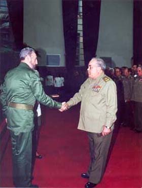 General de División Ermio Hernández Rodríguez Página de gloria De origen social obrero, el hoy General de División Ermio Hernández Rodríguez, aún no era mayor de edad cuando triunfó la Revolución el 1ro. de Enero de 1959. No le gusta hablar en pasado. Para él lo importante es el presente, pero en esta ocasión rompió ese hábito y nos narró acontecimientos importantes en los que participó durante sus misiones internacionalistas en Etiopía y Angola. Hombre pausado, padre de un varón y una hembra, ya abuelo; que hace treinta y siete años era dependiente de almacén, el hoy General de División de las Fuerzas Armadas tiene en la sencillez, su mayor tesoro. (Tomado del libro Secretos de Generales) LUIS BÁEZ —¿Sus orígenes? —Soy espirituano. Desarrollé parte de mi infancia y juventud en el pueblo de Guayos. Mi padre fue obrero agrícola. Comencé la vida laboral a los once años limpiando pisos en los almacenes "La Republica". A los quince ya me consideraban un empleado importante. Empecé ganando siete pesos mensuales. Después me subieron a quince y terminé con un salario de noventa. Un buen sueldo para la época. El dueño del establecimiento me ayudó mucho.