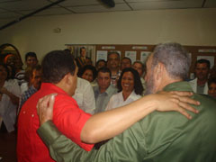 A las 10:31 de la mañana del jueves, Fidel llegó caminando a la casa que sirve de sede de la Misión Médica cubana en AnzoáteguiÁ En medio de alegrías, fotos y emociones, el Comandante en Jefe pidió que alguien los presentara y los invitó a dialogar. Germán Sánchez Otero, embajador de Cuba en Venezuela, explicó que junto a los colaboradores, se encontraban Aldo de Jesús Muñoz, viceministro de Salud y jefe de la Misión Médica, y Javier Labrada Rosabal, coordinador de las Misiones Educativas. El primer tema, fue el de la Misión Barrio Adentro II. Fidel no demoró un segundo en preguntar cómo se estaba desarrollando en Anzoátegui. El doctor Germán Carrera le informó que avanzan las 64 obras de la Salud que servirán de base al revolucionario programa del gobierno bolivariano: 31 Centros Diagnósticos Integrales, 31 Salas de Rehabilitación y Fisioterapia y dos Centros de Alta Tecnología. Tras reflexionar sobre la importancia de estos servicios especializados de Salud para el pueblo venezolano, el Comandante en Jefe preguntó a Javier Labrada y a Yadilka Mederos, coordinadora de las Misiones Educativas en el estado, sobre la marcha de esos programas. Javier le contó que 382 educadores cubanos, laboran en todo el país como Asesores Municipales Integrales, atendiendo a las misiones Robinson I y II, Ribas y Sucre. El próximo domingo, explicó, se estarán graduando 28 000 nuevos alfabetizados, con los que sigue acortándose el camino para declarar a Venezuela Territorio Libre de Analfabetismo. Cuando contaron a Fidel que ya se graduaron los primeros 20 000 nuevos bachilleres de la Misión Ribas, el Comandante les recordó que es muy importante el papel que debe jugar esta misión en la selección y el diagnóstico de cada uno de los estudiantes que comienzan la carrera de Medicina en la Isla, lo que calificó de nueva y extraordinaria idea. En detalles, Fidel contó, de manera especial a los médicos, todo lo que se hace en Cuba para asegurar el éxito de ese nuevo monumento a la solidaridad, y le pidió al embajador Germán, que le hiciera llegar a los colaboradores el documental donde se cuenta cómo se ha preparado el pueblo cubano para recibir en sus casas a los estudiantes. Es increíble, dijo, lo que se está haciendo, el amor con que los cubanos han acogido esta idea. MILAGRO LATINOAMERICANO Unido al tema de la formación