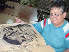 licenciada Olga Vega García muestra el ejemplar del Atlas Ilustrado
