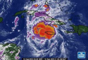 Posición del huracán Charley a la 1:05 A.m. del 12 de agosto. (FOTO TOMADA DEL CANAL DEL TIEMPO)