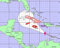 La zona de entrada al país dependerá de cómo se mueva el anticiclón del Atlántico en el transcurso de las próximas 48 horas contadas a partir de hoy viernes, y de la posición y desplazamiento de la hondonada superior extendida sobre el Sudeste de los Estados Unidos y el Golfo de México, la cual puede abrirle un canal de salida por donde el huracán tome una trayectoria al Noroeste y Norte. El doctor José Rubiera, jefe del Centro de Pronósticos del Instituto de Meteorología, explicó que debido a la complejidad de factores vinculados con la futura ruta de Iván, la población, los organismos del Estado y las entidades económicas, deben mantenerse bien atentos a los avisos especiales del Instituto de Meteorología y a las orientaciones de la Defensa Civil. Tras alcanzar en la madrugada de ayer la categoría 5 en la escala Saffir-Simpson, Iván llegó a tener vientos máximos sostenidos de 260 kilómetros por hora y una presión mínima central de 920 hectopascal. Sin embargo, en horas de la tarde se debilitó algo y volvió a clasificar como huracán categoría 4, con vientos máximos sostenidos de 240 kilómetros por hora, según los datos de las ocho de la noche. Por tanto, continúa siendo un sistema tropical en extremo peligroso. Las bandas de nublados con lluvias asociadas a su periferia pueden afectar desde hoy a las provincias orientales, sobre todo en la porción Sur, donde también se iniciarán marejadas con peligro para la navegación. Iván debe moverse hoy al Oestenoroeste para aproximarse de manera gradual a Jamaica, y cruzar sobre o muy cerca de esta isla del Caribe. Precisamente anoche se ubicaba a unos 520 kilómetros al Sudeste de Kingston, la capital jamaicana.