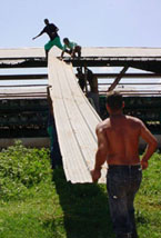 materiales (tejas de fibrocemento, maderas, puntillas, canalones) para
