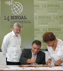 CUBA DEFENDERÁ PRINCIPIOS DEL NOAL Pérez Roque expresó que nuestro país aprecia haber sido escogido como sede del encuentro, lo cual, subrayó, confirma el prestigio y reconocimiento internacionales de la Revolución cubana. La presidencia de Cuba, durante los tres próximos años, se caracterizará por la promoción activa de los principios que dieron vida al No Alineamiento, hoy más vigentes y necesarios que nunca, apuntó. La defensa del derecho internacional, de los pueblos a su soberanía, autodeterminación e independencia, de un comercio justo y de la paz, enfatizó, estará priorizada en el desempeño del Movimiento, que debe tener un papel más protagónico en los organismos internacionales. Al responder a la prensa, el Canciller dijo que la cita de La Habana no está dirigida contra ningún país en particular, aunque aquí se alzará la voz del Tercer Mundo contra las guerras preventivas y las amenazas a cualquier rincón oscuro del planeta. ALTA REPRESENTATIVIDAD Alrededor de medio centenar de jefes de Estado o Gobierno participarán en la Cumbre del NOAL, para la cual confirmaron su asistencia, hasta ayer, 115 de los 116 países miembros, indicó. También lo harán una decena de vicepresidentes, viceprimeros ministros y varias decenas de ministros de Relaciones Exteriores. Once países, del total de 15 aceptados como observadores, así como 34 delegaciones invitadas (incluidas naciones de la Unión Europea y de otros países desarrollados) se unen también a la reunión. Los secretarios generales de Naciones Unidas y la Liga Árabe, el presidente de la Unión Africana, el del Grupo de los 77, que representa a 130 países del Tercer Mundo, serán recibidos también en esta capital. Finalmente expresó, en nombre del Gobierno cubano, un reconocimiento al trabajo de Malasia como actual Presidente del Movimiento por dejar tres años de fecundo trabajo en el cual las naciones no alineadas avanzaron en su activismo. |