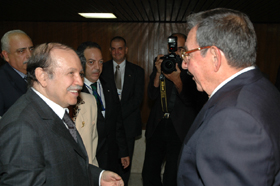 En horas de la noche, el Primer Vicepresidente de los Consejos de Estado y de Ministros, General de Ejército Raúl Castro Ruz, se entrevistó con el Excelentísimo Señor Abdelaziz Bouteflika, Presidente de la República Argelina Democrática y Popular. Ambos líderes pasaron revista al estado actual de los históricos vínculos bilaterales entre ambos países, así como constataron la buena marcha de los trabajos de la Cumbre. Participaron además por la parte argelina Mohammed Bedjaoui, Ministro de Relaciones Exteriores; Abdelatif Rabal, Consejero Diplomático y Ahcene Kerma, Embajador en La Habana. Por Cuba también estuvieron presentes los compañeros Felipe Pérez Roque, Ministro de Relaciones Exteriores; Armando Vergara, Director de la Dirección de África Norte y Medio Oriente del Ministerio de Relaciones Exteriores y el Embajador de Cuba en ese país Roberto Blanco Domínguez. |