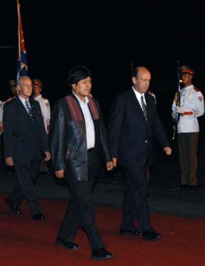 Carlos Lage, vicepresidente cubano, le dio una afectuosa bienvenida en el Aeropuerto Internacional José Martí, donde el visitante recibió los honores correspondientes a su cargo y a la gran amistad que profesa por Cuba. Además, de encabezar la delegación boliviana ante el MNOAL, Morales participará en la Primera Cumbre de países en Desarrollo sin Litoral, que se realizará hoy jueves en horas de la tarde. Situada en la zona centromeridional de América del Sur, Bolivia es país sin acceso marítimo, con una población de ocho millones 700 mil habitantes, en una superficie superior al millón de kilómetros cuadrados. Se espera que en ambas citas, Bolivia plantee su demanda de restitución de una salida soberana al mar, considerada una deuda histórica al perder con Chile grandes territorios, por una guerra en el siglo XIX azuzada por ávidos intereses de potencias imperiales de entonces. Les arrebataron 120 mil kilómetros cuadrados de tierras y 400 kilómetros de costa, lo que ha originado un diferendo con el país vecino, debido al fracaso de las negaciones para hallar soluciones a la controversia. En el segmento ministerial de la XIV Cumbre, el canciller David Choquehuanca dijo que Bolivia solicitará al MNOAL que respalde el proceso de cambios revolucionarios emprendido por el presidente Evo Morales. Asimismo, mostró confianza en una revitalización de la agrupación, que sea beneficioso para procesos como el de su país, que está siendo amenazado por fuerzas externas que quieren debilitar su proceso democrático, según precisó. (AIN) |