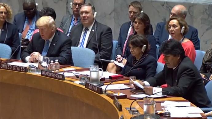 A la par del Debate General de la ONU, sesiona el Consejo de Seguridad presidido por primera vez por Donald Trump, donde el Presidente boliviano ha hecho un llamado a la paz durante su pronunciamiento. Evo Morales conminó a «dejar en el pasado el uso de armas entre los pueblos», y señaló específicamente a EE. UU. por sus acciones contradictorias en torno a la paz mundial. El Presidente boliviano argumentó además que EE. UU. no se encuentra interesado en preservar la justicia, recordando sus amenazas a los mecanismos de investigación de la Corte Penal Internacional. «Si así fuera (…) no promovería el uso de la tortura», acotó el mandatario. (Cubadebate)