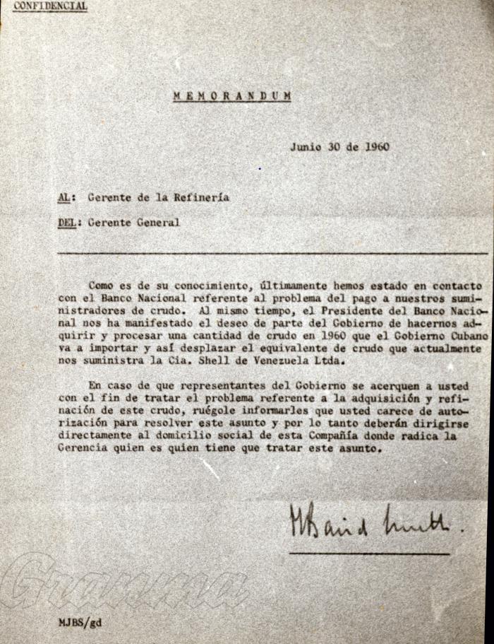 En carta dirigida al presidente del Banco Nacional de Cuba con fecha 6 de junio del corriente año, la respuesta de la Esso, de la Shell y de la Texaco fue negativa, es decir que se negaban a refinar el petróleo proveniente de la URSS, que Cuba adquiría más barato y, además, pagándolo con azúcar.