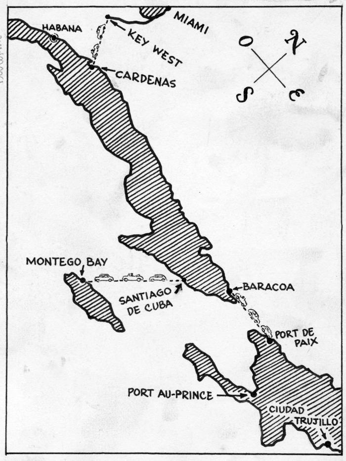 «Este mapa esquemático muestra la situación de Cuba, de Jamaica y de Haití-República Dominicana con respecto a Estados Unidos, y las distancias que actualmente la mayoría de los turistas recorren en avión.