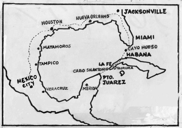 «Los que salgan de Boston, Albany, Baltimore y Filadelfia se ahorrarán no menos de 1,062 millas para llegar a Ciudad México; los que salgan de Richmond o Ashville, Alabama, más de 1,250 millas; más de 1,875 millas los de Columbia y Atlanta, y más de 2,500 millas desde Jacksonville o Miami, pasando por Cuba en vez de dirigirse hacia el Oeste para cruzar la frontera mexicana-estadounidense».