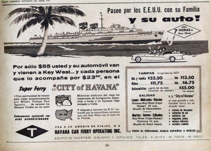Para que los lectores de mi generación recuerden y los de ahora lo conozcan, Cuba estaba enlazada con la Florida desde finales de la década de 1950 por medio de un ferry llamado SS City of Havana. La embarcación se dedicaba, fundamentalmente, a transportar turistas con sus automóviles, con una frecuencia de tres viajes a la semana.