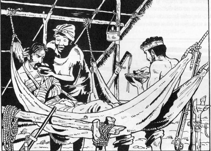 «Ella mataba a tiros el ganado, descuartizaba la res y sus enfermos comían carne. Ella concentraba potasa de la leña verde y aplicaba este cauterio o el del fuego enrojeciendo la baqueta de su fusil. Con el mayor cariño lavaba las heridas y las úlceras con las lociones vegetales, que son sin cuento, experimentándolas al antojo del enfermo desesperado por el dolor, y ella cosía, cocinaba, remendaba y zurcía las escasas y raídas ropas, manteniendo vivo el espíritu de todos, sin descuidar jamás lo tocante a vigilancia. Era una verdadera hermana de la caridad, sin rezos ni escapularios, sin el temor al Báratro ni la aspiración al cielo, que mueven a los caracteres místicos».