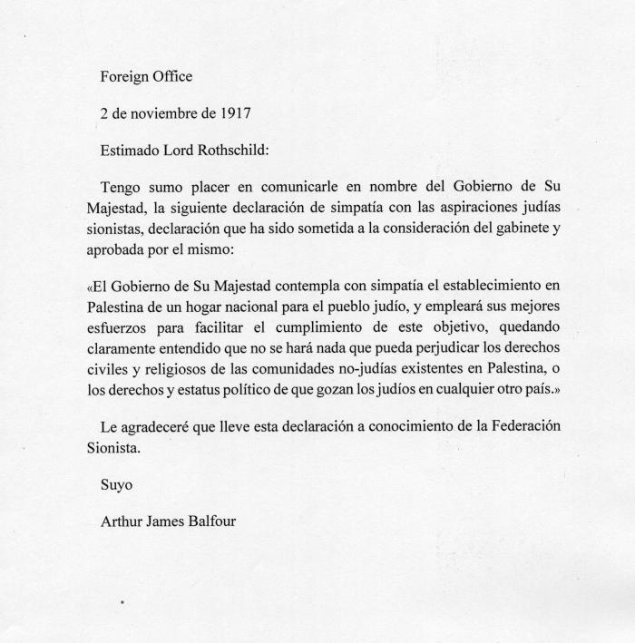 La decisión respondía a la llamada «Declaración de Balfourt» cuando Reino Unido en 1917, por intereses guerreristas, sin encomendarse a nadie prometió públicamente entregarles a los judíos, que residían en el exterior, tierras palestinas para que establecieran allí «un hogar para el pueblo judío». Estas fueron las 67 palabras que dieron pie a la creación del estado de Israel y al histórico conflicto judío-palestino.