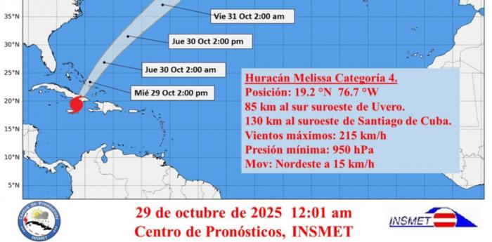 El huracán Melissa se aproxima a la costa sur de la región oriental de Cuba. En las últimas horas sus vientos máximos sostenidos han aumentado hasta 215 kilómetros por hora, con rachas superiores y su presión central es de 950 hectoPascal. Continúa siendo un huracán de gran intensidad, nuevamente con categoría cuatro en la escala Saffir-Simpson, de un máximo de cinco.