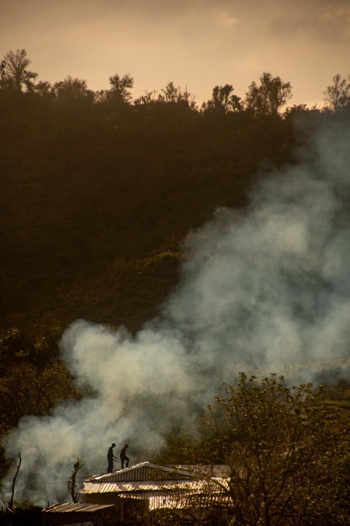 Es 4 de noviembre. Todavía las cosas de valor –el televisor, la loza, los teléfonos, las sábanas, las fotos– andan en cajas y la mitad de la casa al descubierto, sin el techo; bajo el sol, la lluvia y las estrellas, según corresponda; y Héctor subido en los techos de por ahí, dando golpes secos que estremecen la tranquilidad de la loma.