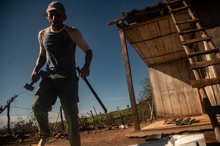 Santa Isabel, Guamá, Santiago de Cuba. – Héctor Espinoza, de 53 años, se ha subido a arreglar al menos seis techos de este caserío, mientras su vivienda permanece corrida y apuntalada con tres o cuatro troncos por el norte, que fue hacia donde el viento del sur quiso tirarla.