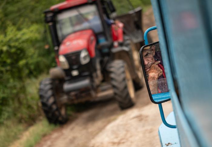 No son muchos los que van en este Ural. Andan despiertos desde las cinco de la mañana. Entre el overol azul y algún que otro invento, difícil es verles más que las manos y los ojos. Se excusan en que los mosquitos anclados a sus lomos «están criaos con sangre´e vaca»: culpa de la vaquería que servirá como referencia para decir «Estamos después de…», cuando alguien, por teléfono, pregunte.