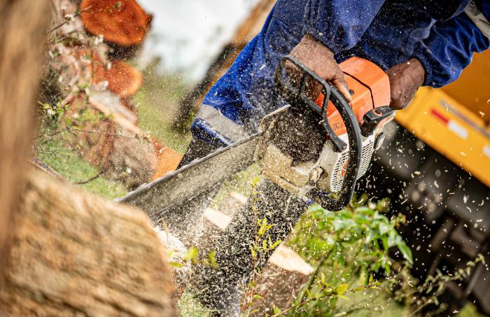 A la hora del almuerzo, la gente se sienta en dondequiera para digerir en paz. De fondo, una motosierra, a base de troncos, hace «calzos» para las torres de emergencia.