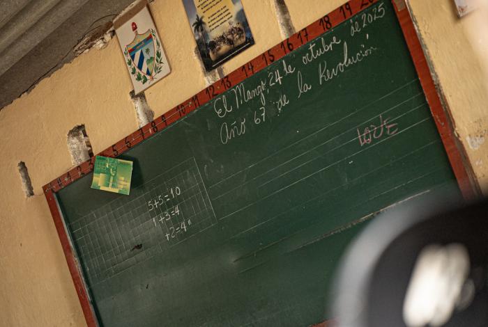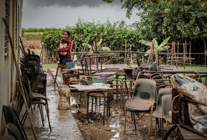 En la escuela Lorenzo Céspedes Ferrales no quedó televisor vivo y muchas mesas son esqueletos metálicos, sin tablero alguno. Se refleja el desastre en los ojos de una niña cargada en brazos desde el patio y en el pequeño charco que existe bajo un Martí inerte al que uno mira con respeto, por si reencarna.