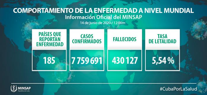 Hasta el 14 de junio se reportan 185 países con casos de COVID-19 que asciende a 7 millones 759 mil 691 casos confirmados (+ 133 mil 808) y 430 mil 127 fallecidos (+ 4 mil 196) para una letalidad de 5,54% (-0,05).