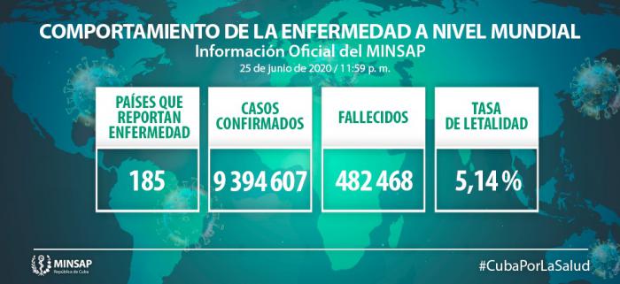 Hasta el 25 de junio se reportan 185 países con casos de COVID-19, asciende a 9 millones 394 mil 607 casos confirmados (+ 165 mil 558) y 482 mil 468 fallecidos (+ 5 mil 199) para una letalidad de 5,14 % (-0,04).
