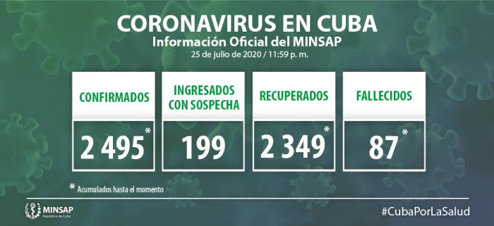 De los 2 mil 495 pacientes diagnosticados con la enfermedad, se mantienen ingresados confirmados 57 (2,2%), el 100% presenta una evolución clínica estable. Se reportan 87 fallecidos (ninguno del día), dos evacuados y 2 mil 349 pacientes recuperados (94,2%) (cuatro altas del día). No se reportan pacientes en estado crítico ni grave.