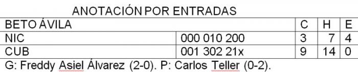 Cuba marcó la primera del juego por tubeyes consecutivos de Frederich Cepeda y Yadiel Hernández. Y siguió jugando agresivo, con un doble robo y un squeeze play como jugadas llamativas, combinadas por oportunos sencillos de Yulieski Gourriel y Alfredo Despaigne, además de un costoso error del jardinero izquierdo Miguel Morales dejando caer un elevado de Cepeda en la cuarta entrada donde los campeones se distanciaron de sus rivales con tres anotaciones. El mentor nicaragüense Noel Áreas utilizó a seis lanzadores en un intento por detener la ofensiva cubana pero todo fue en vano.