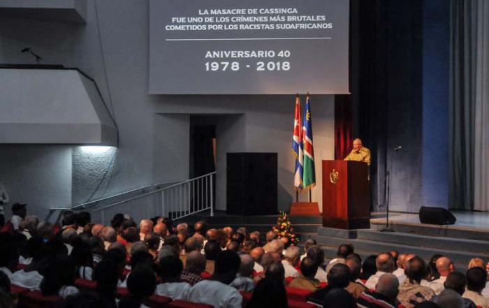 Acto central por el 40 Aniversario de la Masacre de Cassinga, en la Sala Universal de las FAR, interviene General de Cuerpo de Ejercito Álvaro López Miera (podio), Viceministro Primero de las Fuerzas Armadas Revolucionarias Jefe del Estado Mayor, presidieron Salvador Valdés Mesa, Miembro del Buró Político del Comité Central del Partido Comunista de Cuba y Primer Vicepresidente del Consejo de Estado, Nangolo Mbumba, Vicepresidente de Namibia