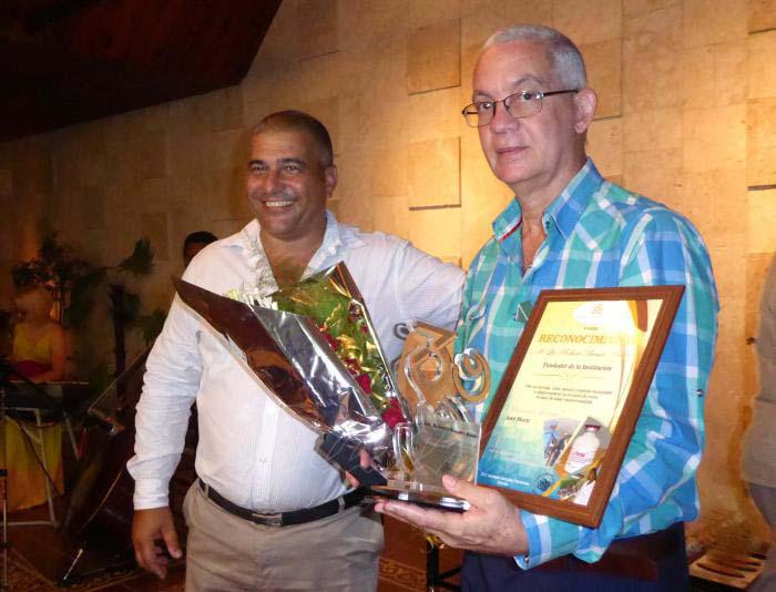 Roberto Basulto Baker recibe de manos de Nemecio González Fernández, director del CIGB de Camagüey, el reconocimiento como fundador de la institución. Foto del autor.
