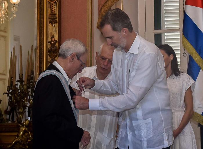 Rey de España, Felipe VI, condecora a Eusebio Leal Spengler (historiador de La Habana), con la Gran Cruz de la Real y Distinguida Orden Española de Carlos III, en el Palacio de los Capitanes Generales