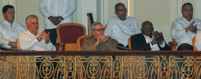 El General de Ejército, Raúl Castro Ruz, Primer Secretario del Partido Comunista de Cuba, el Presidente de la República, Miguel Díaz-Canel Bermúdez, y el Segundo Secretario del Partido, José Ramón Machado Ventura, asisten en la mañana de este 16 de noviembre a la Sesión Solemne de la Asamblea Provincial del Poder Popular, que tuvo lugar en la sala García Lorca del Gran Teatro Alicia Alonso en saludo al 500