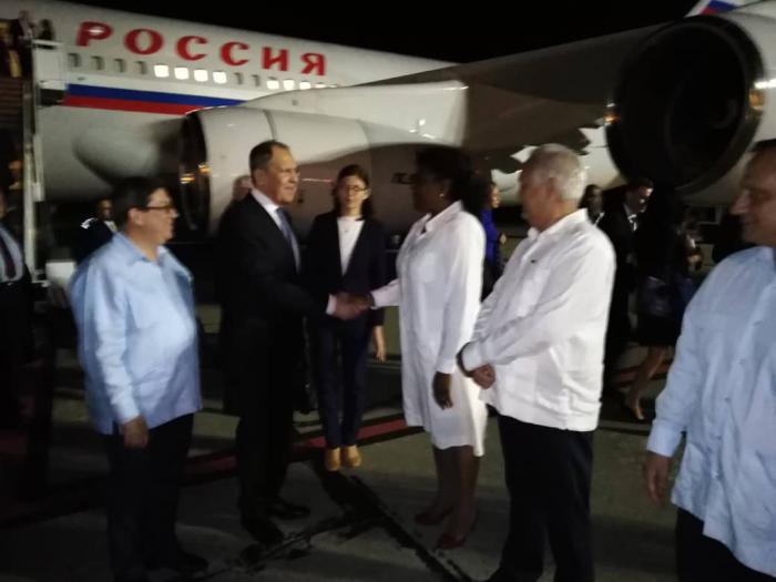 Serguéi Lavrov, a su llegada, fue recibido en el aeropuerto por su homólogo cubano y la gobernadora provincial, Beatriz Johnson.