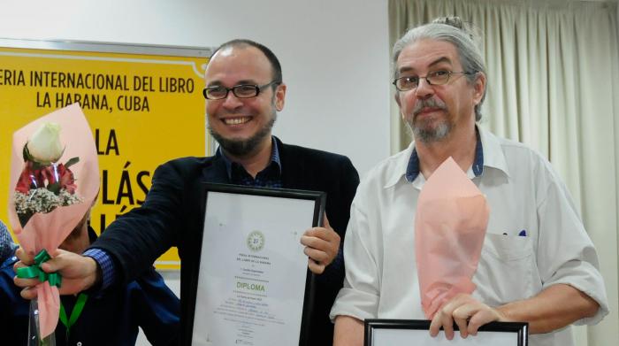Alberto Garrandel (derecha) recibe el premio Puerta de Papel, desarrollado en la sala Nicolás Guillén de La Cabaña.