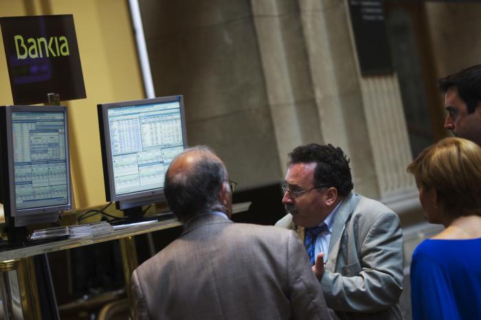 Inversores charlan en la bolsa de Madrid, España, en una imagen de archivo.