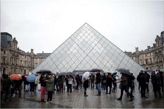 Foto de archivo de turistas haciendo fila en el Louvre después de que los empleados decidieran no ir a trabajar como consecuencia del brote de coronavirus.